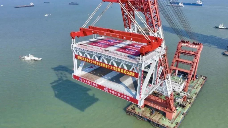 2月1日上午 中鐵大橋局承建的常泰長江大橋 主航道橋首個1280噸的鋼梁吊裝完成 巨力索具1900噸大節(jié)段鋼梁吊具 全程保障該項(xiàng)目吊裝順利進(jìn)行 贏得兔年“開門紅” 為公司實(shí)現(xiàn)一季度開門紅創(chuàng)造有利條件本次吊裝為常泰長江大橋主航道橋常州側(cè)邊跨首個大節(jié)段鋼梁,更是全橋首個大節(jié)段鋼梁,此次鋼梁吊裝完成,標(biāo)志著常泰長江大橋建設(shè)又邁出堅(jiān)實(shí)的一步。鋼梁吊裝至滑移支架上后,將通過拖拉滑移系統(tǒng)拖拉300m至設(shè)計(jì)位置。