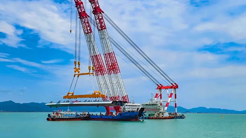 寧波至象山市域(郊)鐵路象山港跨海大橋主橋邊跨結(jié)合梁架設(shè),巨力索具鋼箱梁吊具全程保障項(xiàng)目吊裝。