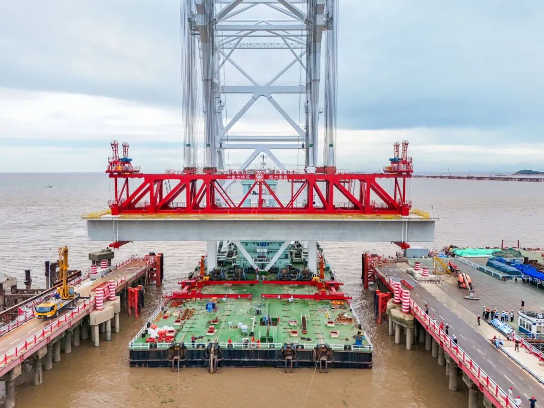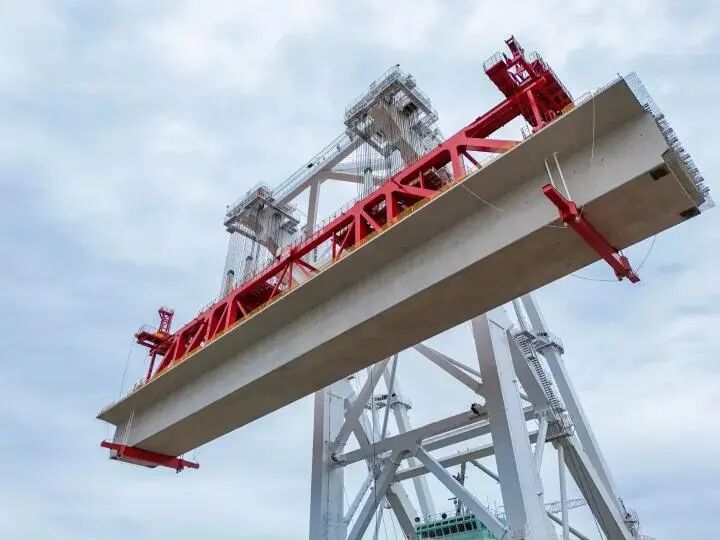 巨力索具生產(chǎn)制造的預(yù)制箱梁吊具與中鐵大橋局研制的“天一號(hào)”運(yùn)架一體船協(xié)同作戰(zhàn),采用“低平潮取梁、漲潮期運(yùn)輸、平潮期落梁”的精準(zhǔn)調(diào)度方案,克服了海域潮汐變化大、海上風(fēng)浪干擾強(qiáng)、運(yùn)輸距離長等諸多施工難題,將落梁誤差控制在毫米級(jí),最終將這新一代“世界梁王”架設(shè)到位。