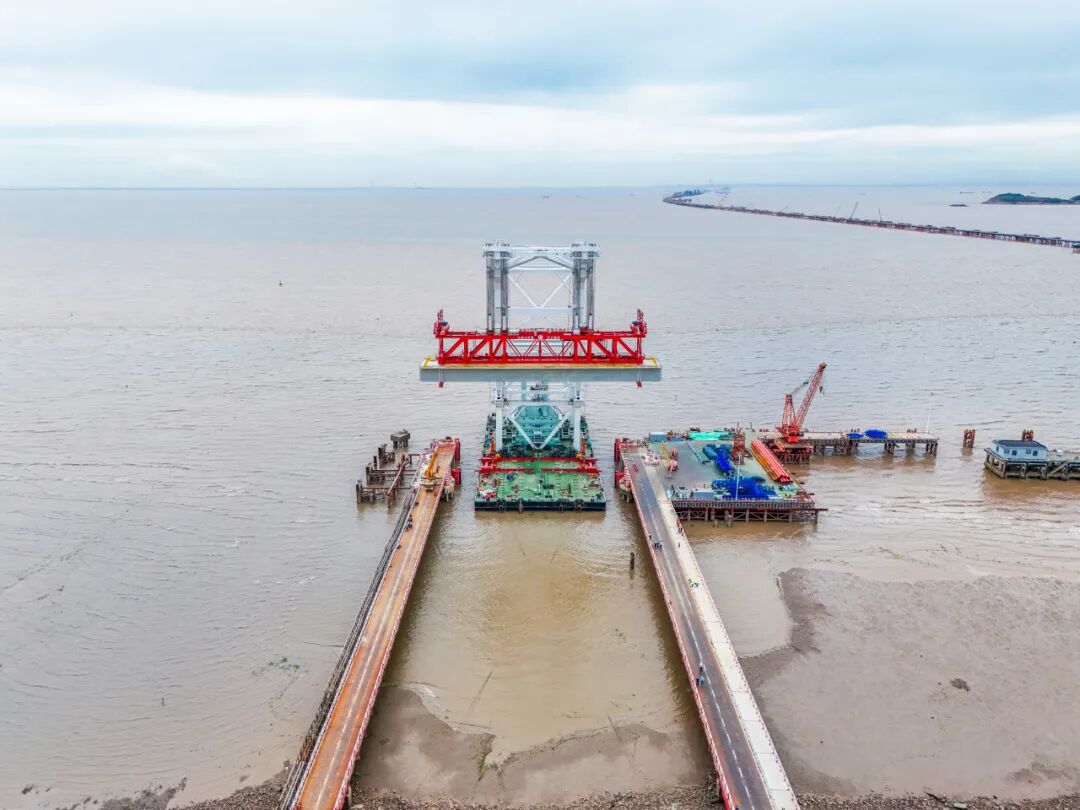 本次架設(shè)的首孔80米預(yù)制混凝土箱梁同時(shí)也是全橋首孔海上箱梁,長78.2米、高5.4米,架設(shè)后的跨度將達(dá)到80米,重2800噸,相當(dāng)于2000輛小汽車的重量。