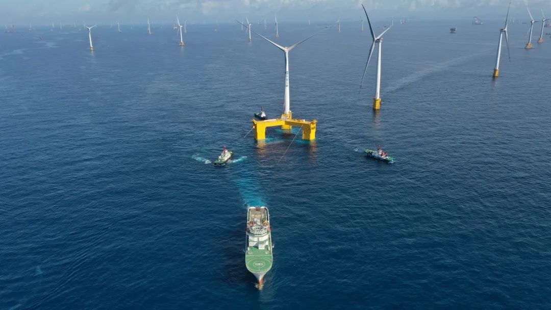 12月7日13時37分,全球首臺抗臺風型漂浮式海上風電機組,在廣東陽江海上風電場成功并網發電。