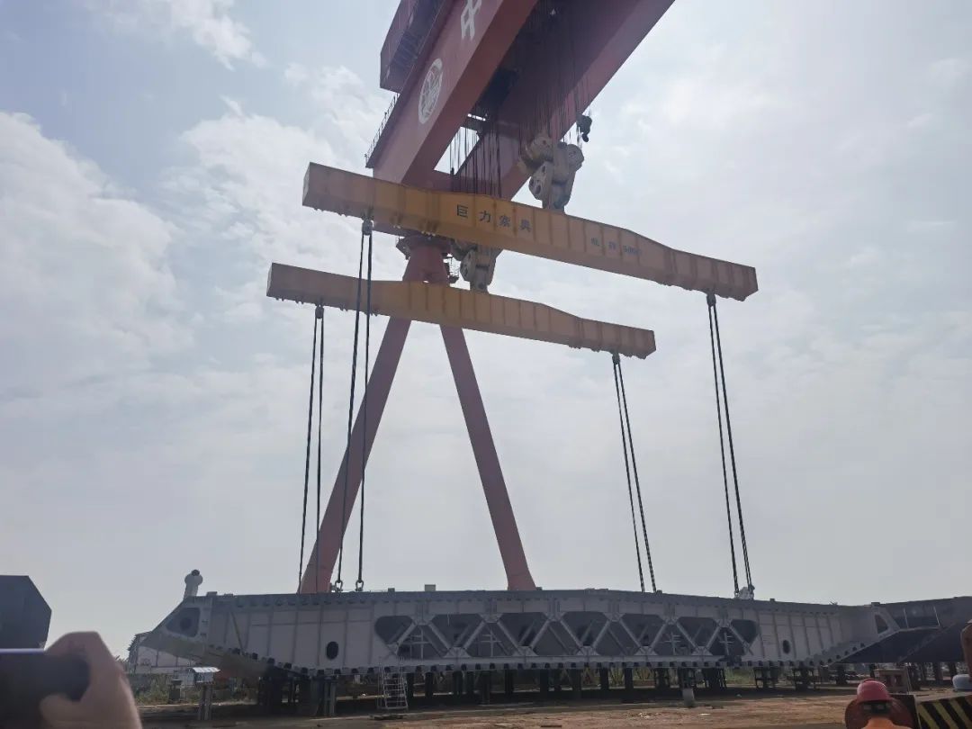 據了解,超大重量的鋼箱梁具有結構尺寸大、重量重、受力復雜等特點,吊裝方案設計之初,巨力索具項目團隊針對以上情況多次展開吊裝方案的探討論證,為提前應對鋼梁架設過程中出現的各種困難,項目團隊提前籌劃,準備了多種吊裝預案,突破了以往鋼箱梁抬吊的固有思路,極大地優化了鋼箱梁起運施工效率,確保鋼梁架設的安全性控制。