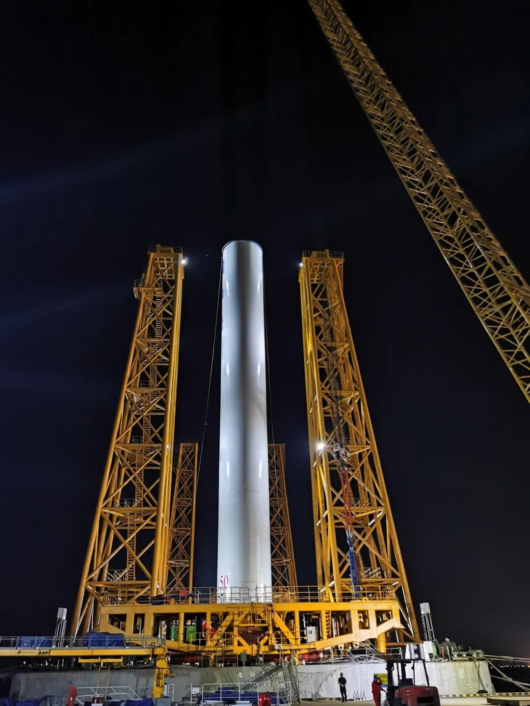 華能山東半島南4號海上風電項目,風機整體最大重量為650噸,該吊裝設備包括運輸底座、井字架、平衡梁、電氣系統、液壓系統、緩沖系統等部件構成,是巨力索具在北方沿海地區海上風電首個風機整體吊裝項目。此次吊裝難度大,作業區域風大、浪高、水深達30米,巨力索具及各參建單位協同作戰、逆勢攻堅。