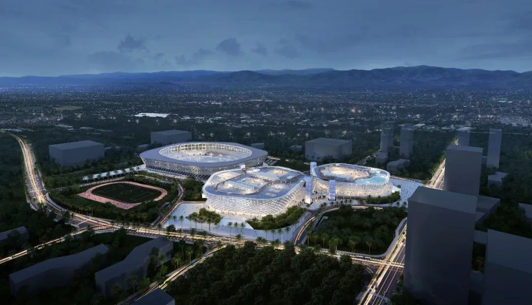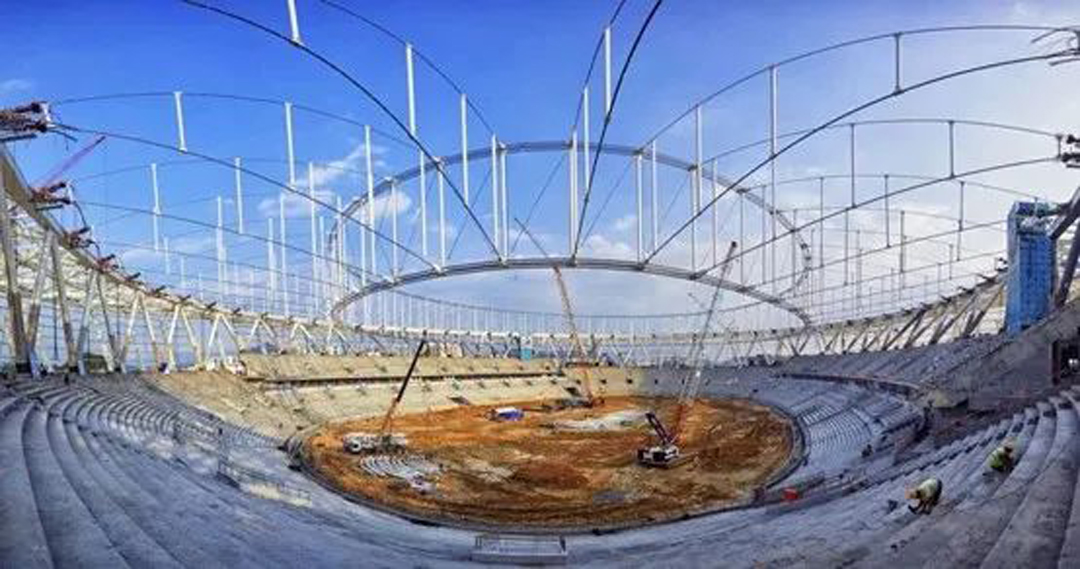該體育場整體外輪廓平面投影為不規則的倒角五邊形,其外輪廓南北最大長度約305米,東西約270米,罩棚最高點標高約46米。從體育場內的觀眾席處仰望,一根根鋼索交織連接,各自用力拉伸,巨大鋼網架躍然呈現,好似一座兼具了力學、美學、科技的藝術品。
